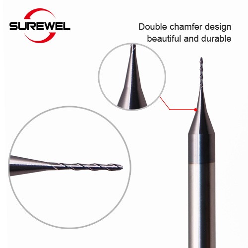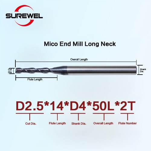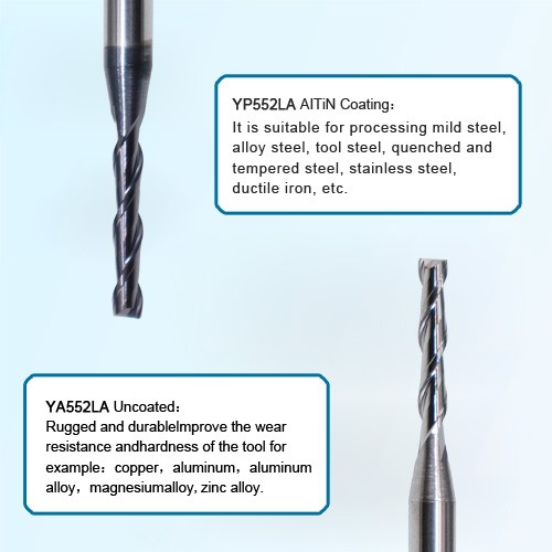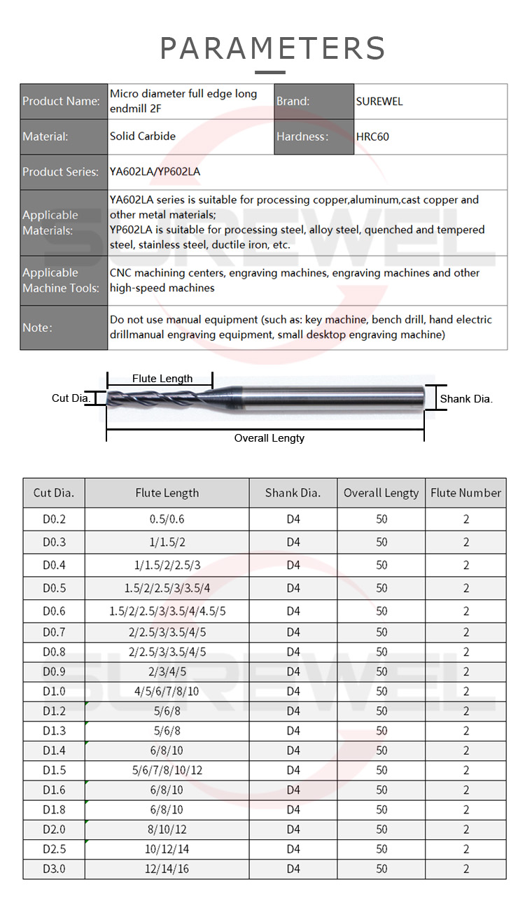 Material:Carbide Diameter:D0.2~3.0mm Overall Length:50mm Handle Diameter:4mm Coating:AlTiN Uncoated:Suitable for processing copper,aluminum,cast copper and other metal materials; AlTiN:Black coating is suitable for steel, alloy steel, carbon steel, tool steel and other materials within HRC55.